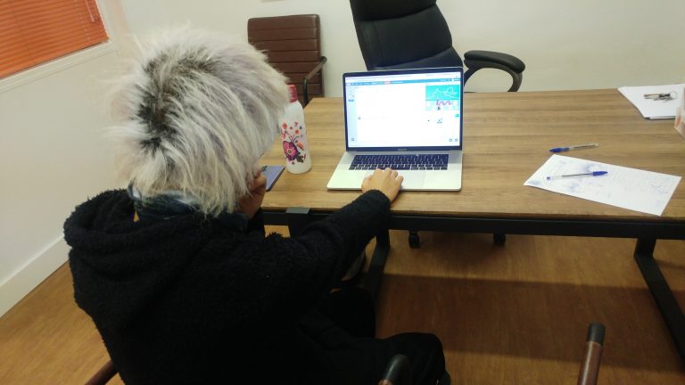 Hoy, al comenzar la sesión, Víctor elige la actividad «Entrenar el habla», de forma que mantenemos un diálogo, por primera vez, con palabras. Después grabamos